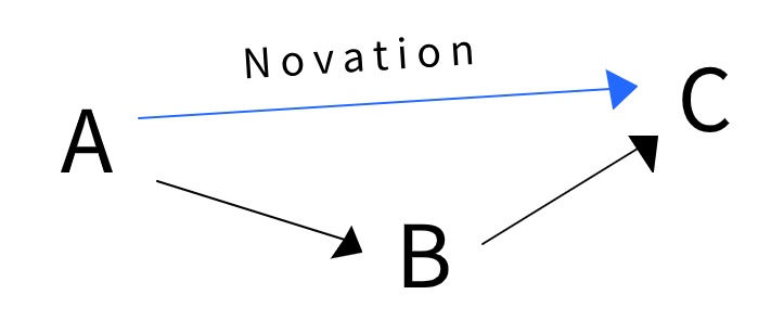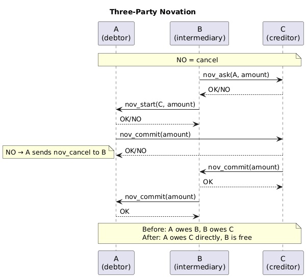 Any node in the inverted central network that has both debt in and debt out, can then request to move, or ânovateâ, that debt so it is directly between the debt in node and to the debt out node. This is the same thing that happens in the central network variant with A to bank to B to bank to C, but it is computationally decentralized, i.e., fast. And with payment channels with Bitcoin behind them, also trustless or trust-minimized.
