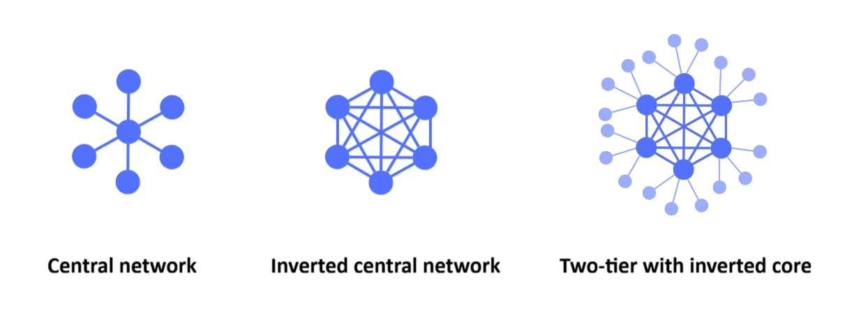 The network of routers does not have to be a perfect inverted central network. I.e., everyone does not need to have links to everyone else, but the closer you get to the ideal the better it works (to the point where it works perfectly when it is perfect inverted central network).