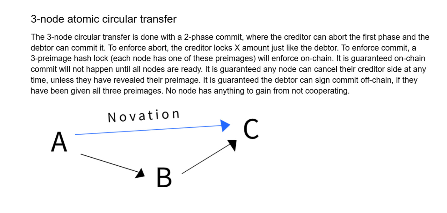 The multihop clearing is loop clearing. This is well known since thousands of years. That novation is “just circular payments” is misrepresentative. The typical loop clearing (in the paradigm that Fugger and LN was part of and Evgeni Pandurski worked on too) is along debt. These are “just circular payments” yes, that is exactly how those are done, and why they exist in LN. But novation is not just a circular payment. It is not along debt at each hop, and it is only meaningful in a specific scenario: only one of the three nodes is intermediary in terms of debt. Randomly doing three node “loop payments” would only achieve this in very few cases.