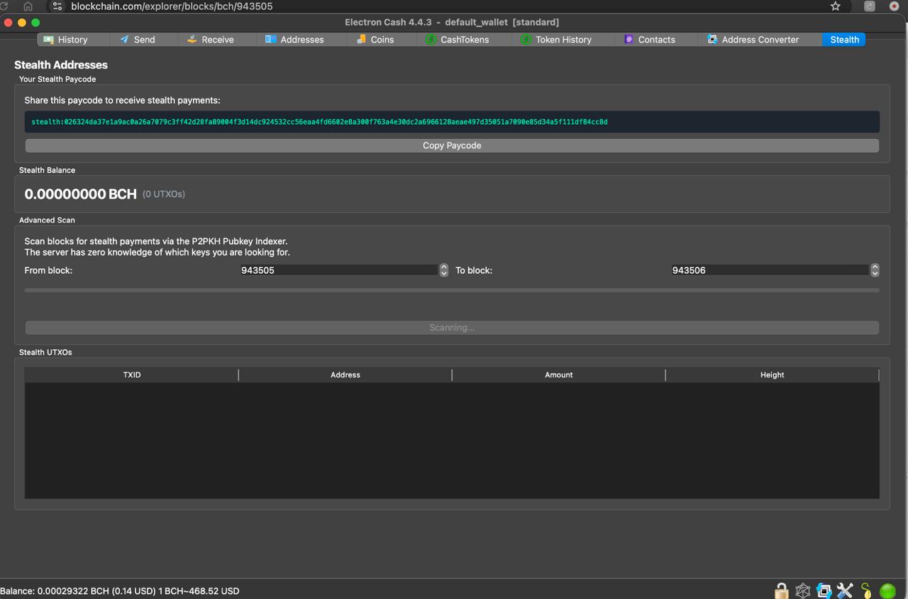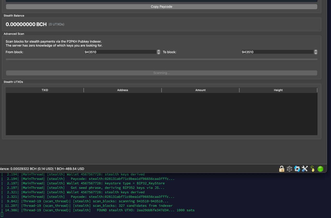 Receiving stealth: requires scan private key. 00-Wallet today. EC plugin natural next step (has plugin system, secp256k1, Fulcrum, Ledger/Trezor, Nostr, RPA, CashFusion).
