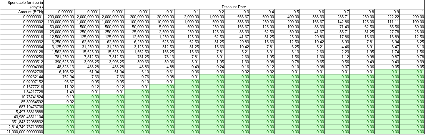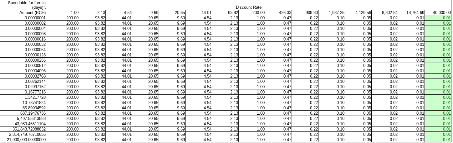 That’s 0.7/ideal-day (ideal-day=144 blocks). I prefer it mapped to ideal-day, easier to conceptualize. At 0.7/day, a typical 150-byte input will become free-to-relay in 214 days. We could target half-a-year-to-be-free. That means 0.82/ideal-day, hold for full quarter for a 50% discount, month for 16% discount, and week for a 4% discount.