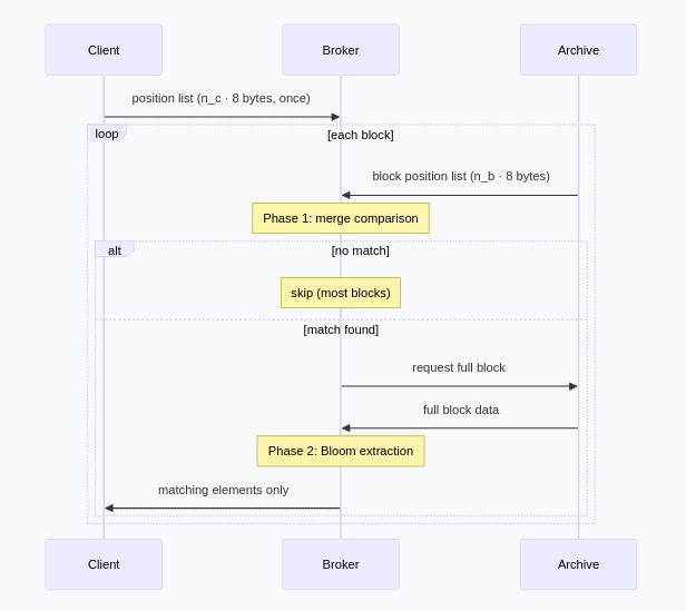 Position lists in a large hash space provide cheap elimination with near-perfect accuracy. When elimination fails, the same positions fold to a standard BIP-37 Bloom filter for element extraction. The construction requires no novel primitives—only sorted lists, merge comparison, and modular arithmetic. It can be viewed as adding an efficient pre-filter to the existing BIP-37 protocol.